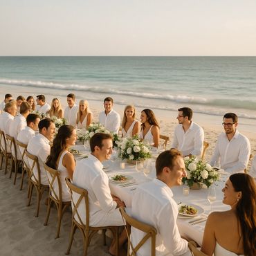 As the sun sets, the evening comes alive with music. A Full Live Band delivers soulful vocals, world-class musicianship, and the kind of rhythm that gets even the shyest guest dancing. Whether you prefer smooth lounge vibes or high-energy hits, we tailor the performance to your perfect night. Now, picture your guests gathered around a long, beautifully adorned table, indulging in a Mediterranean-Caribbean fine dining experience. They savor freshly caught fish, exquisite starters, and the finest local wines. We don’t just imagine it—we make it happen. Let’s bring your dream wedding to life.